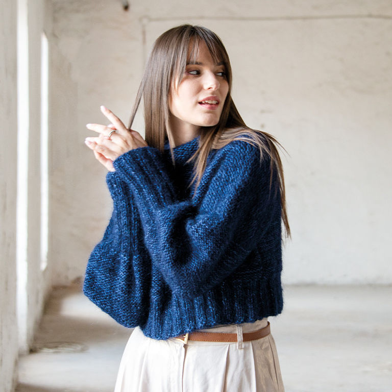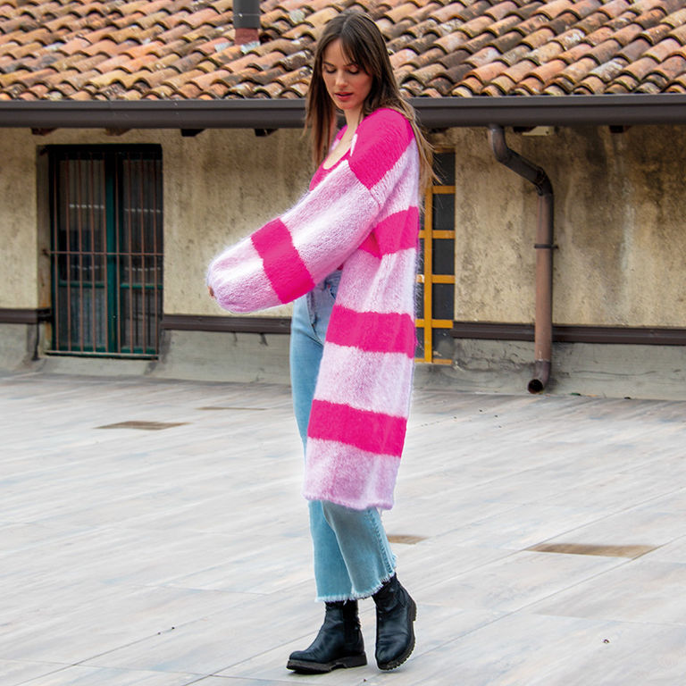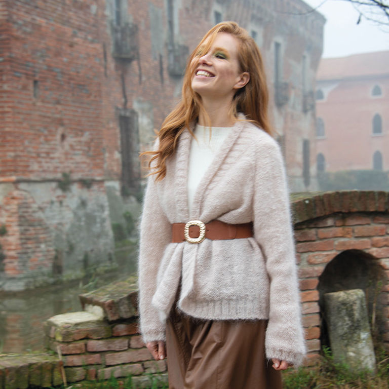 Lieve is a single thread yarn, a mixed wool with a very high percentage of Kid Mohair, a precious fiber that has made a strong comeback during the last seasons, whose fibers are tied with a polyamide thread. It’s characterized by being a gauzed thread, therefore it’s fuzzy, light and very soft: it’s the gauzing process that “rips” the thread with the help of micro hooks that extract part of the fiber creating a fuzzy effect. It’s a thread suitable for creating soft, informal sweaters with simple patterns or characterized by relief points. It’s like wearing a hug. And like anything precious it must be cared for in the right way; Lieve can in fact be considered delicate, and for what concerns treatment it’s best to wash it by hand.