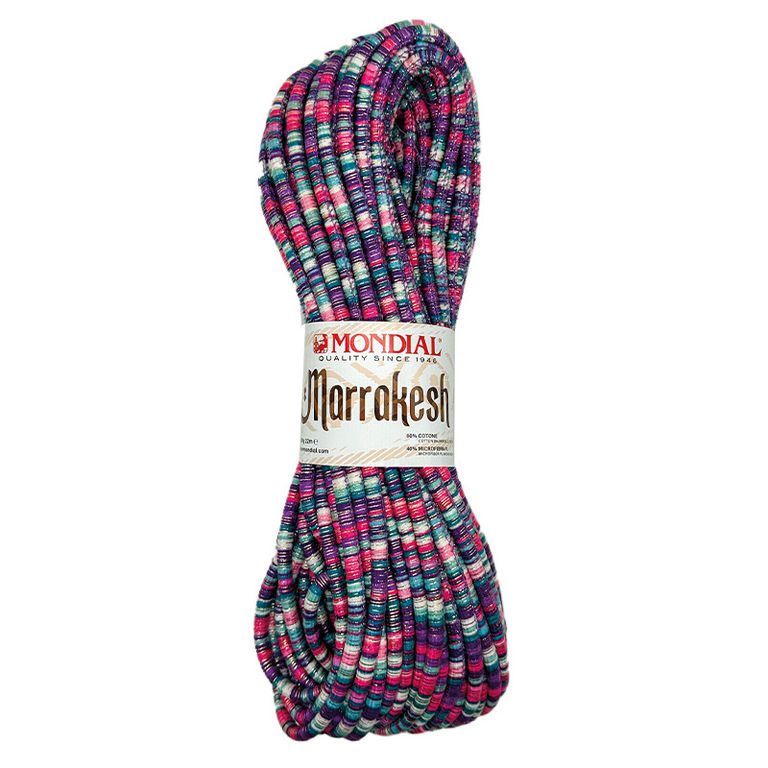 Marrakesh is an extraordinary and original yarn that combines microfiber cord with multicolored, striped cotton fabric and lamé inserts. This versatile yarn is perfect for creating accessories and small jewelry pieces. When crocheted with an auxiliary thread, it forms a unique ‘cage’ that enables you to craft an array of items such as bags, baskets, and placemats. Marrakesh is the ultimate tool to unlock your creativity and bring your ideas to life!