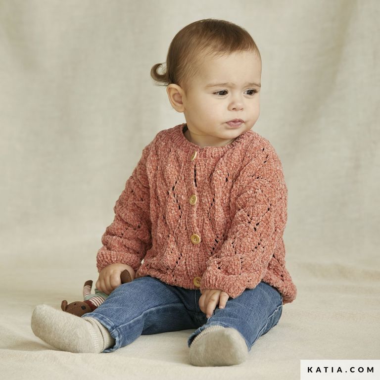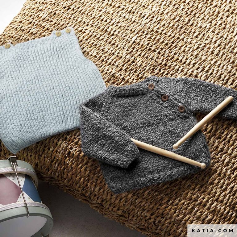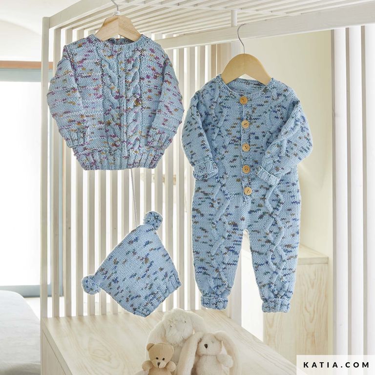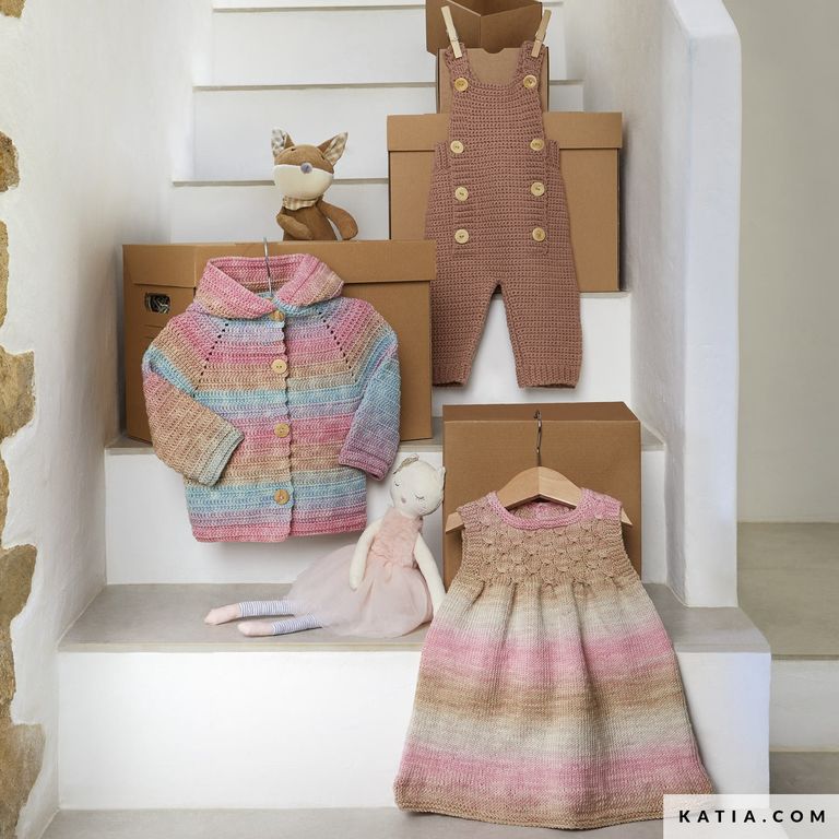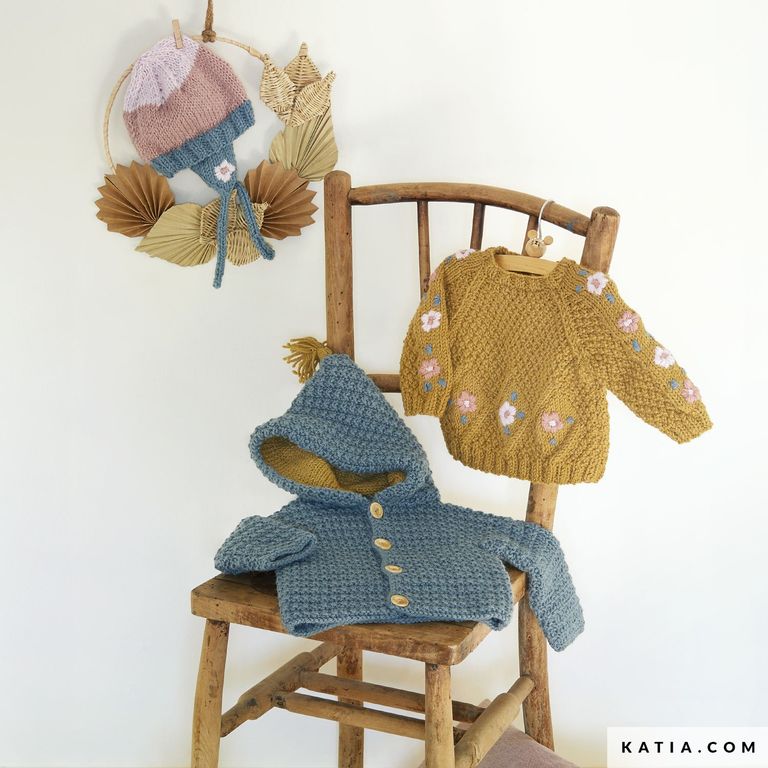 Find up to 41 patterns for simple, clean pieces in the Katia Baby 102 magazine. Discover the excitement of knitting clothes for your baby —from 0 to 2 years of age— with the wide color range of different Katia yarns. Cardigans, sweaters, rompers, dresses, trousers, bloomers... in a wide range of pink and blue tones, but also beige, cream, tan and several tones of lilac and purple.