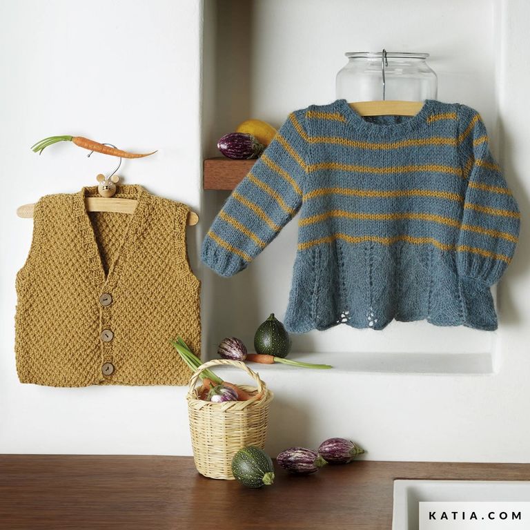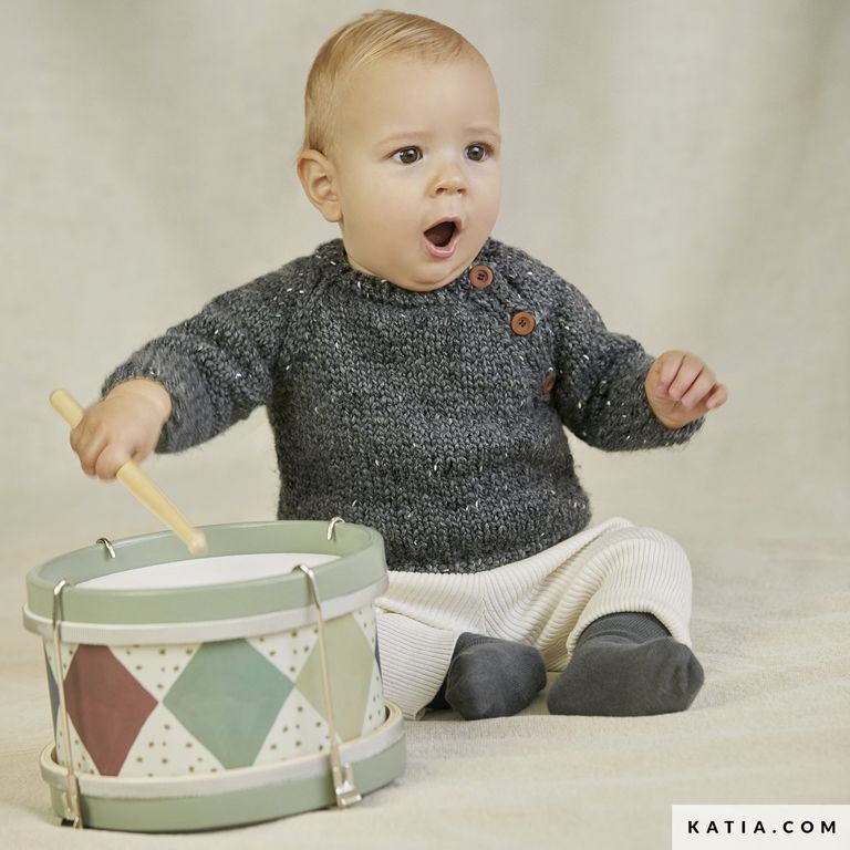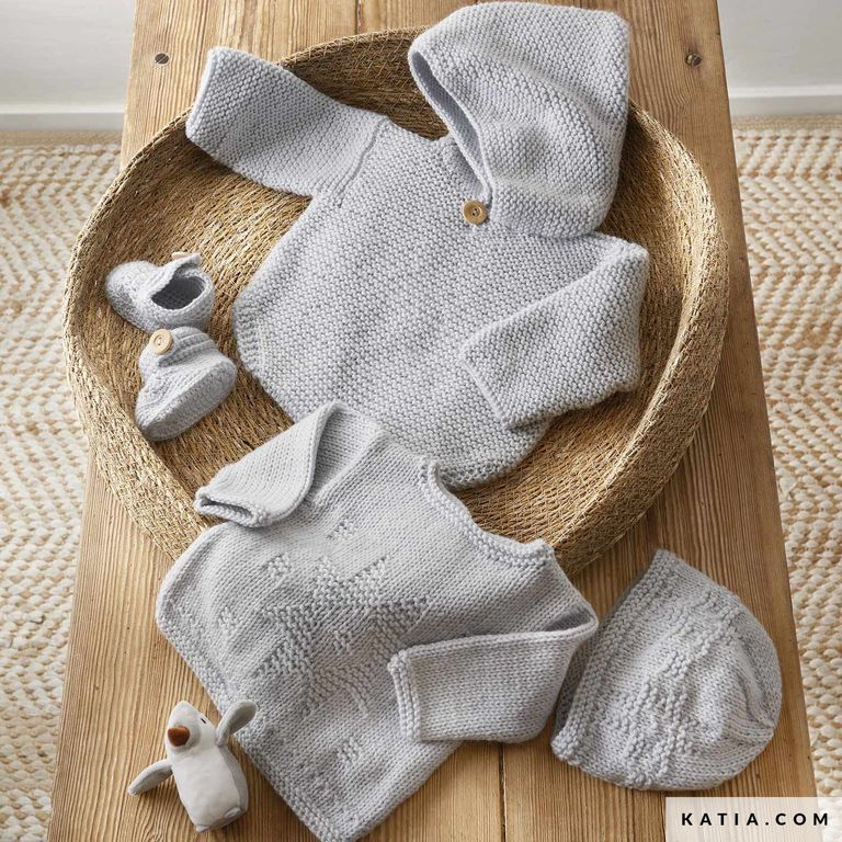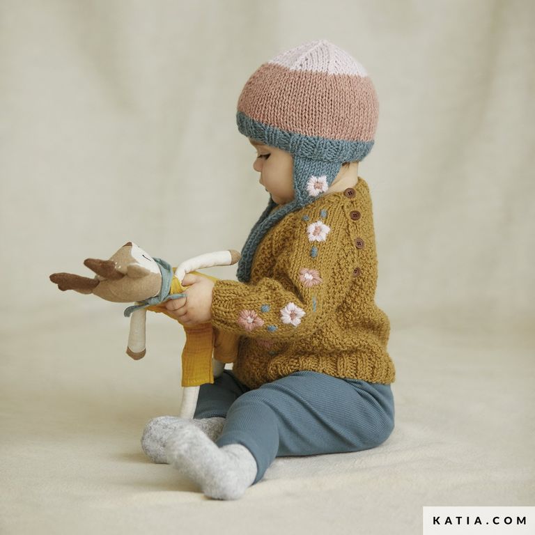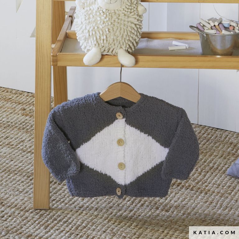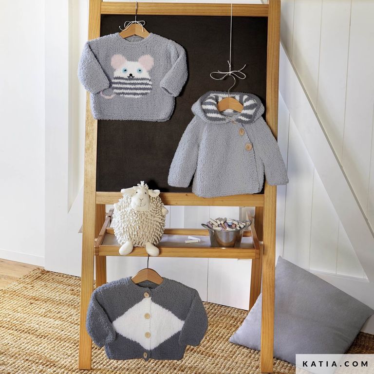 Find up to 41 patterns for simple, clean pieces in the Katia Baby 102 magazine. Discover the excitement of knitting clothes for your baby —from 0 to 2 years of age— with the wide color range of different Katia yarns. Cardigans, sweaters, rompers, dresses, trousers, bloomers... in a wide range of pink and blue tones, but also beige, cream, tan and several tones of lilac and purple.