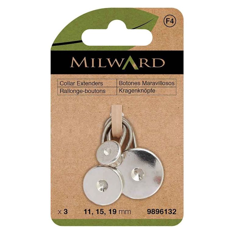 The collar extender consists of a button with an elastic loop. You can place the loop around the button of your collar and then close the collar with the button of the collar extender in the buttonhole. Each package contains 3 collar extenders in 3 different button sizes: 11, 15 and 19 mm wide.